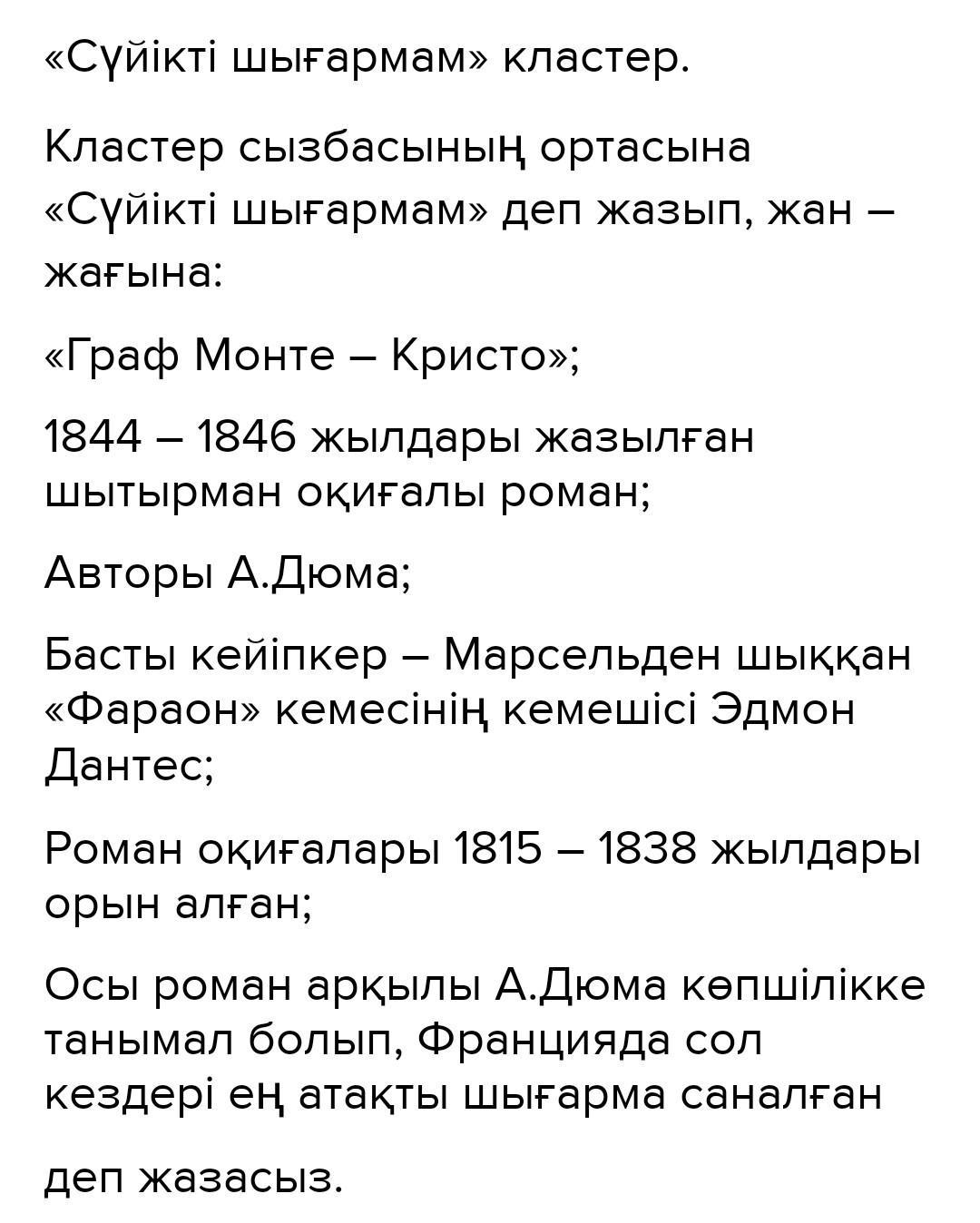 ЖАЗЫЛЫМ 2 -тапсырма «Сүйікті шығармам» сөзіне кластер жаса. Кластер бойынша шағын мәтін құрап жаз.