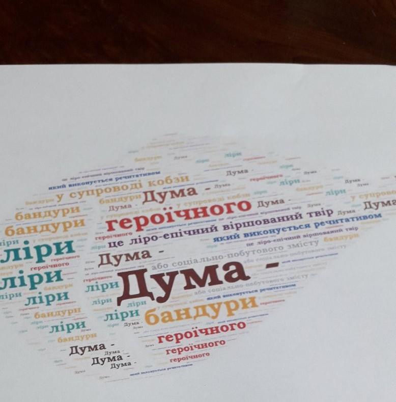 Дума- це ліро-епічний віршований твір героїчного або соціально-побутового змісту, який виконується речитативом у супроводі кобзи, бандури чи ліри.