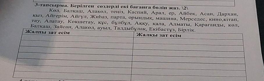 3-тапсырма. Берілген создерді екі баганга болiп жаз. \2\ Көл, Балқаш, Алакол, теңіз, Каспий, Арал, ер, Айбек, Асан, Дархан, қыз, Айгерім, Айгүл, жиһаз, парта, орындық, машина, Мерседес, кино,кітап, тау, Алатау, Кокшетау, қүс, бүлбүл, Аққу, қала, Алматы, Қарағанды, кол, Балқаш, Зайсан, Алакол, ауыл, Талдыбұлақ, Есібастұз, Бірлік. Жалпы зат есім Жалқы зат есім MA та по