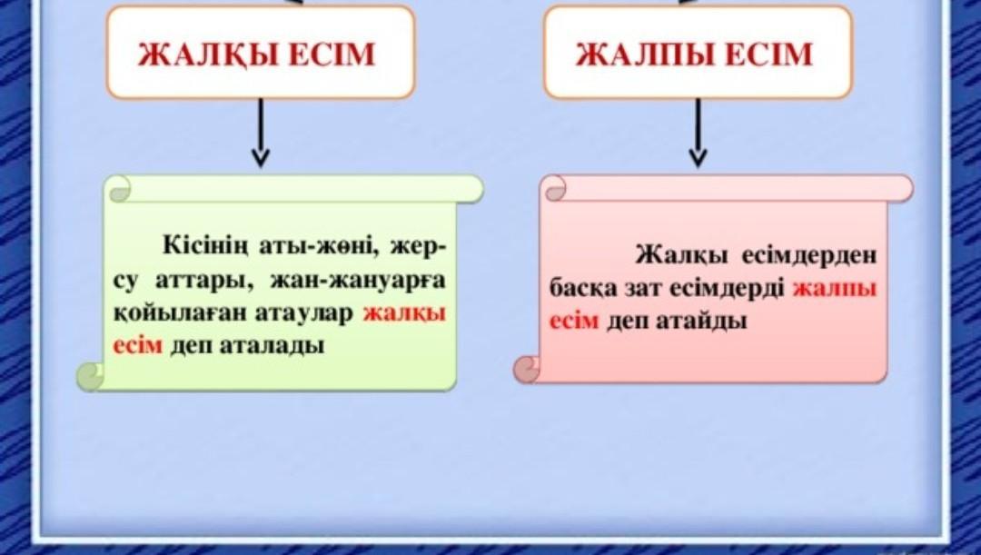 Жалпы есім: теңіз, ер, қыз, жиһаз, парта, орындық, машина, кино,кітап, тау, қүс, бүлбүл, қала, көл, ауыл