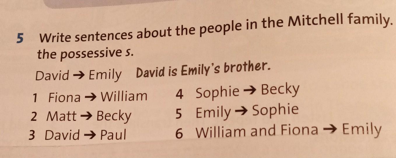 5 Write sentences about the people in the Mitchell family. Use the possessive s. David → Emily David is Emily's brother. 1 Fiona William 4 Sophie → Becky 2 Matt → Becky 5 Emily → Sophie 3 David → Paul 6 William and Fiona → Emily