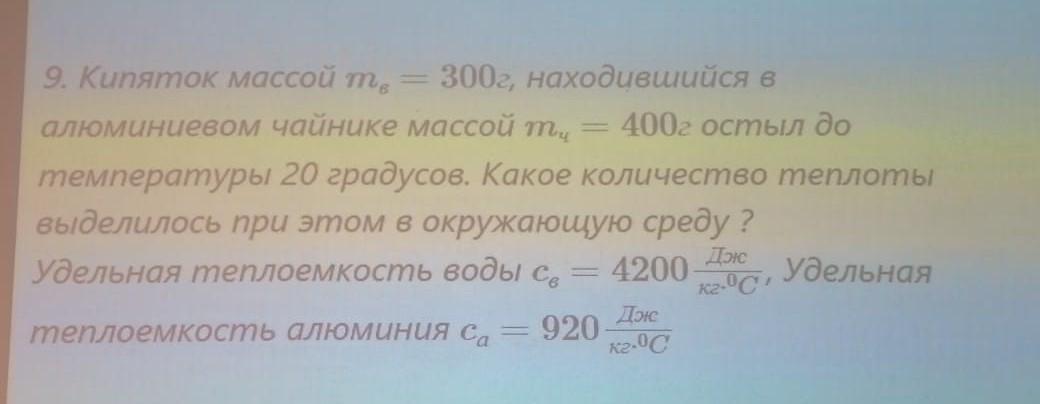 Q2=∆t×c(чай)×m2=80°×920Дж:кг°С×0,4кг=29440Дж