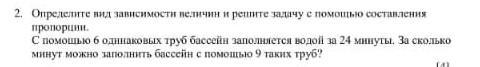 опредилите вид зависомости велечины и решите задачу с пропорциями составление С помощью 6 одинаковы труб бассейн заполняется водой за 24 минуты.За сколько минут можно заполнить бассейн с помощью 9 труб