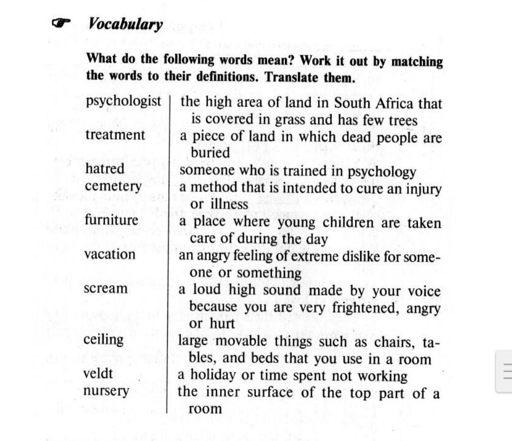 e Vocabulary What do the following words mean? Work it out by matching the words to their definitions. Translate them. psychologist | the high area of land in South Africa that is covered in grass and has few trees a piece of land in which dead people are buried treatment hatred someone who is trained in psychology a method that is intended to cure an injury or illness a place where young children are taken care of during the day an angry feeling of extreme dislike for some- one or something a loud high sound made by your voice because you are very frightened, angry or hurt large movable things such as chairs, ta- bles, and beds that you use in a room a holiday or time spent not working the inner surface of the top part of a cemetery furniture vacation scream ceiling veldt nursery room