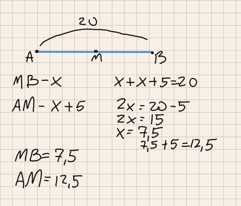 Отрезок АВ равен 20 см. Точка М принадлежит АВ . Чему равен отрезки МВ если АМ > МВ на 5. Чему равен отрезок полученный из центра отрезков АМ и МВ