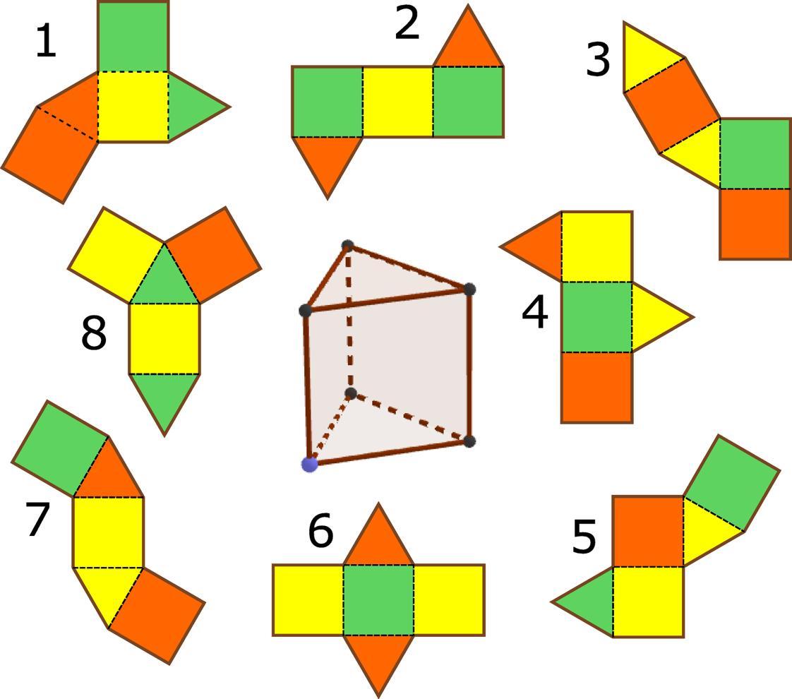 На рисунке вы видите призму и 8 развёрток. Из каких двух развёрток, если их сложить по пунктирным линиям, получатся одинаково раскрашенные призмы?