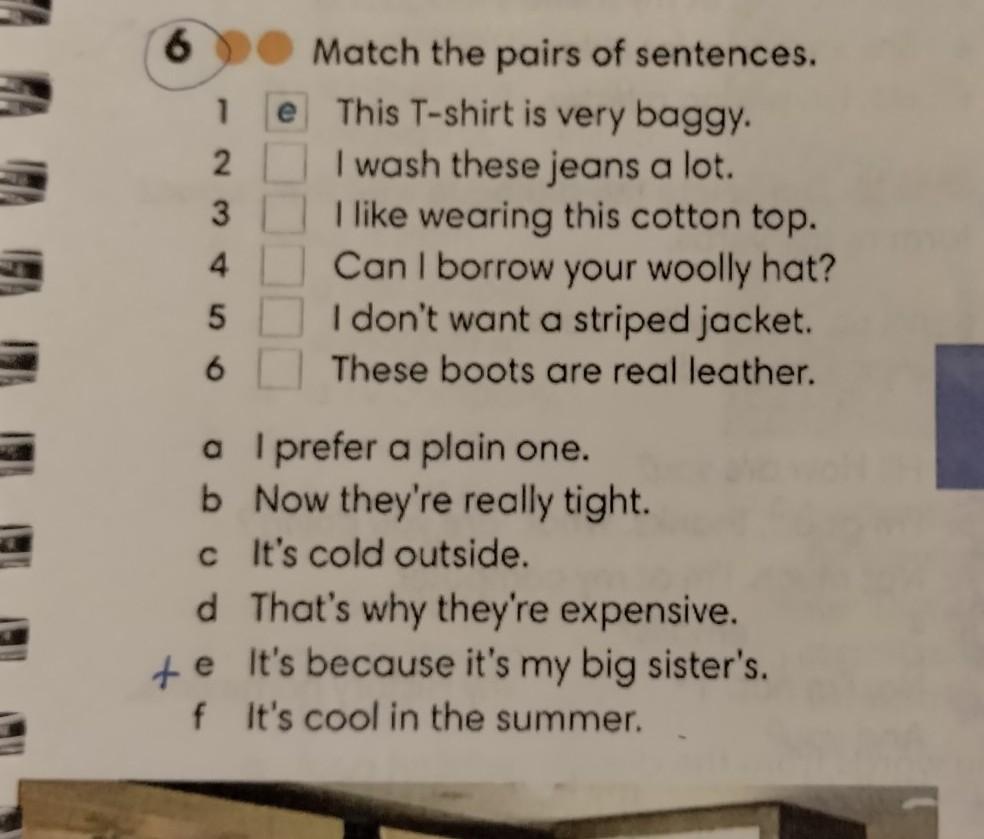 1. This T-shirt is very baggy. e) It’s because it’s my big sister’s.