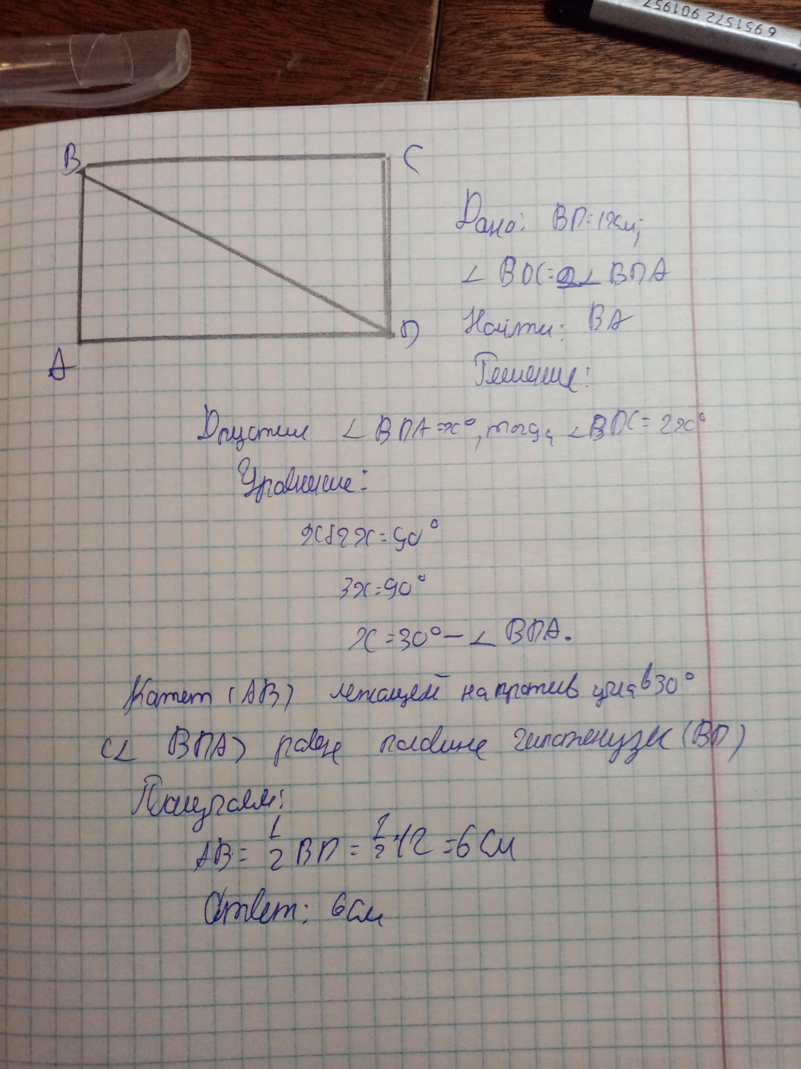 Діагональ прямокутника дорівнює 12 см і утворює зі сторонами кути, один із яких удвічі більший за другий. Знайдіть довжину меншої сторони прямокутника.