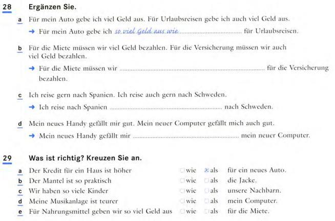b. Für die Miete müssen wir so viel Geld wie für die Versicherung bezahlen.