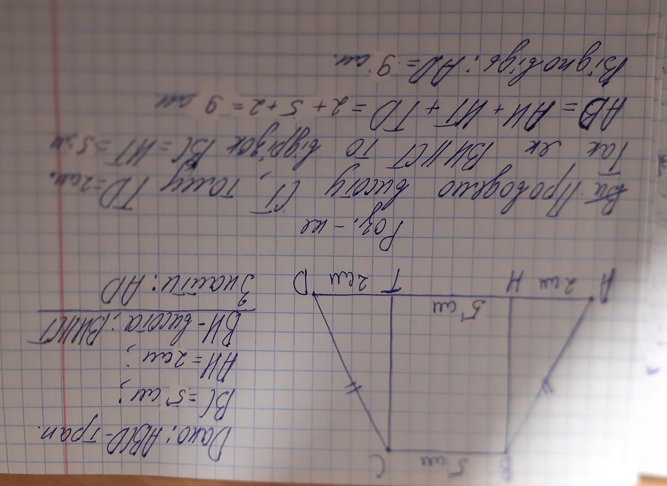 Менша основа рівнобічної трапеції дорівнює 5 см. Знайдіть більшу основу, якщо висота, проведена з вершини тупого кута , ділить її на відрізки , один із яких дорівнює 2 см
