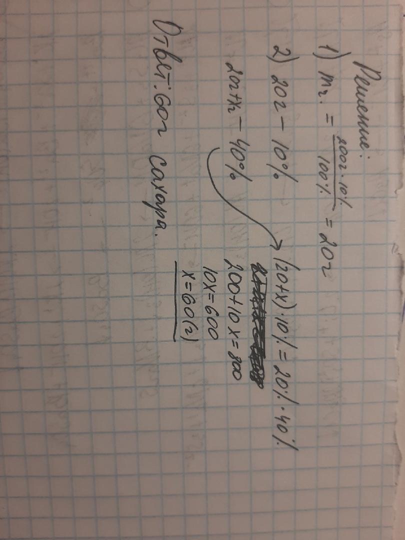 Сколько нужно добавить сахара к 200 г раствора соли с массовой долей соли 10%, чтобы получить сахарный сироп с массовой долей сахара 40 %?
