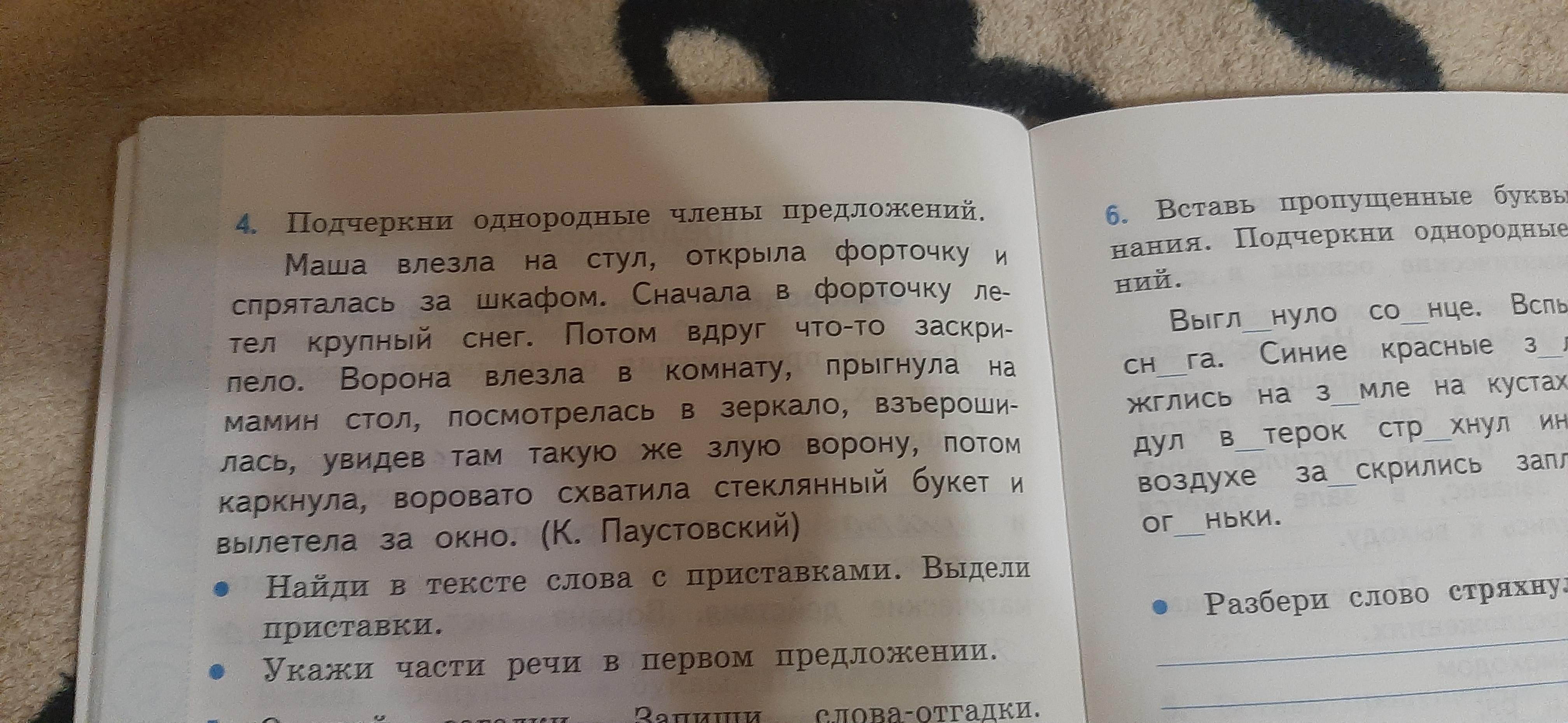 Однородные члены : влезла, прыгнула, посмотрелась, взъерошилась, увидев, каркнула, схватила, вылетела
