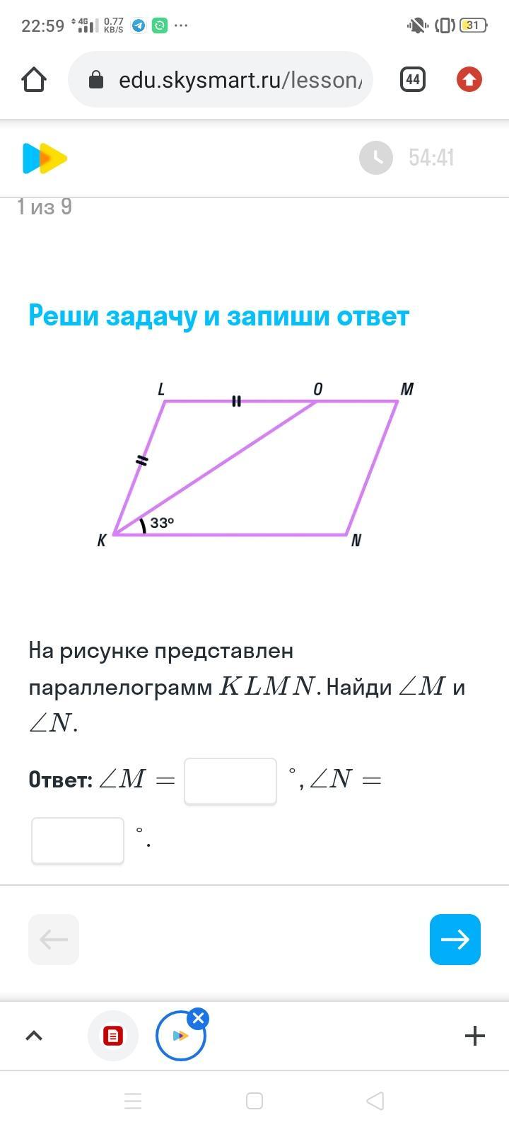 KLMN - параллелограмм, отрезок КО пересекает сторону LM в точке О таким образом, что KL=LO. ∠OKN=33°.