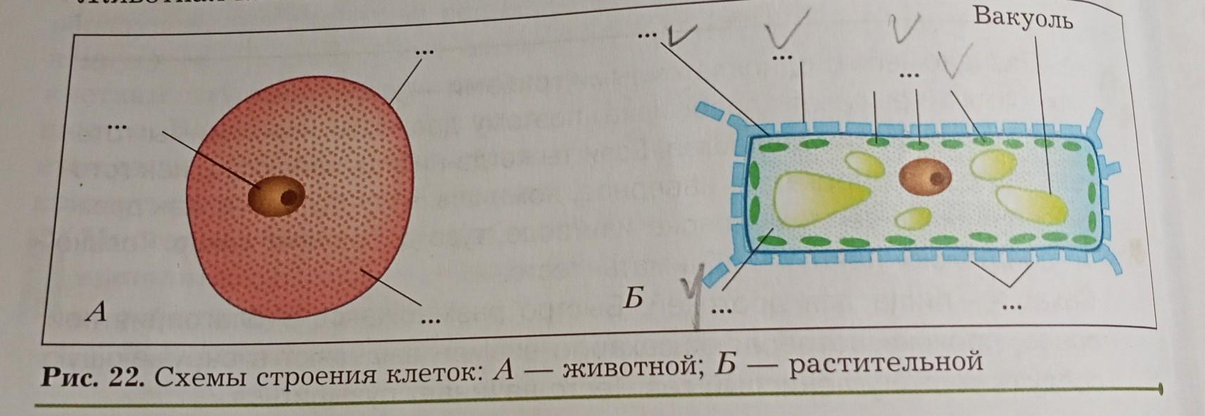 цитоплазма, в которой находится ядро, митохондрии (энергетические станции клетки), хлоропласты (зеленые пластиды, с помощью которых происходит фотосинтез), вакуоли