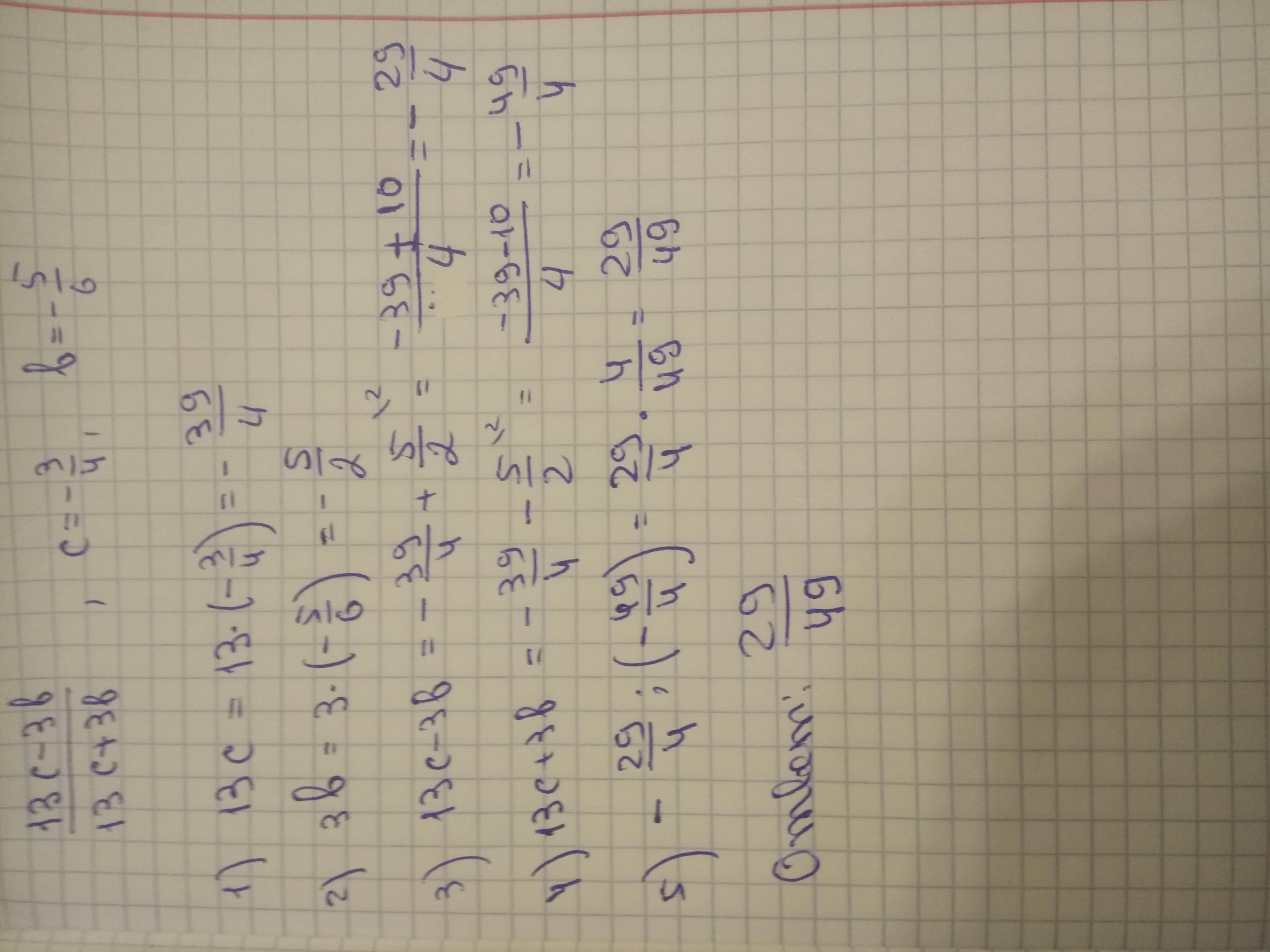 Найдите значение выражения 13с-3b/13c+3b, при с=-3/4; b=-5/6 Пожалуйста с подробным решением! Даю 10 баллов!!!