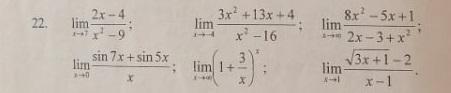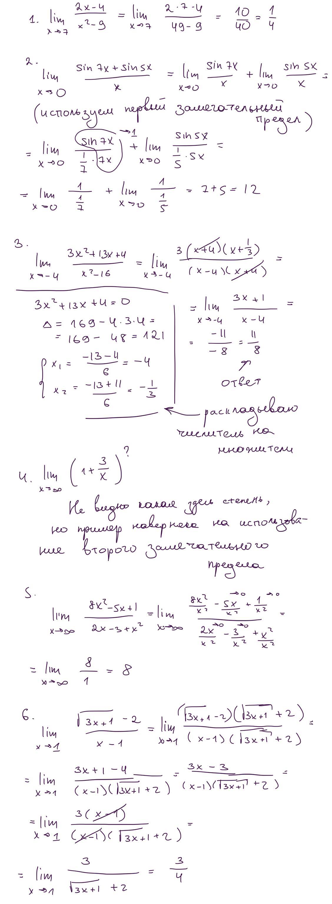последний предел домножим на сопряженное. =((3x+1)^(1/2)-2)(3x+1)^(1/2)+2)/((3x+1)^(1/2)-+2)(x-1))=(3x+1-4)/((3x+1)^(1/2)-+2)(x-1))=3(x-1)/((3x+1)^(1/2)-+2)(x-1))=3/(3x+1)^(1/2)-+2)