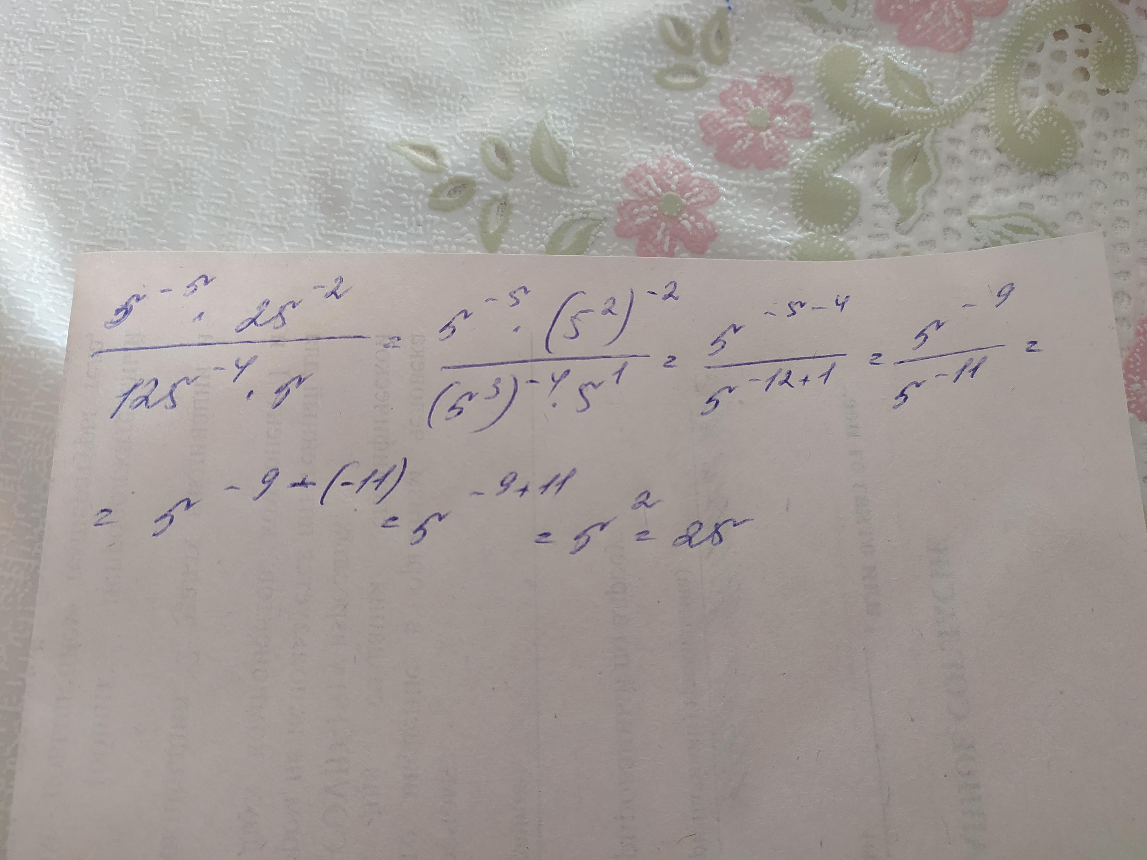 Помогите 5^-5 * 25^-2 / 125^-4 * 5 с обьеснением пожалуйста 25 баллов