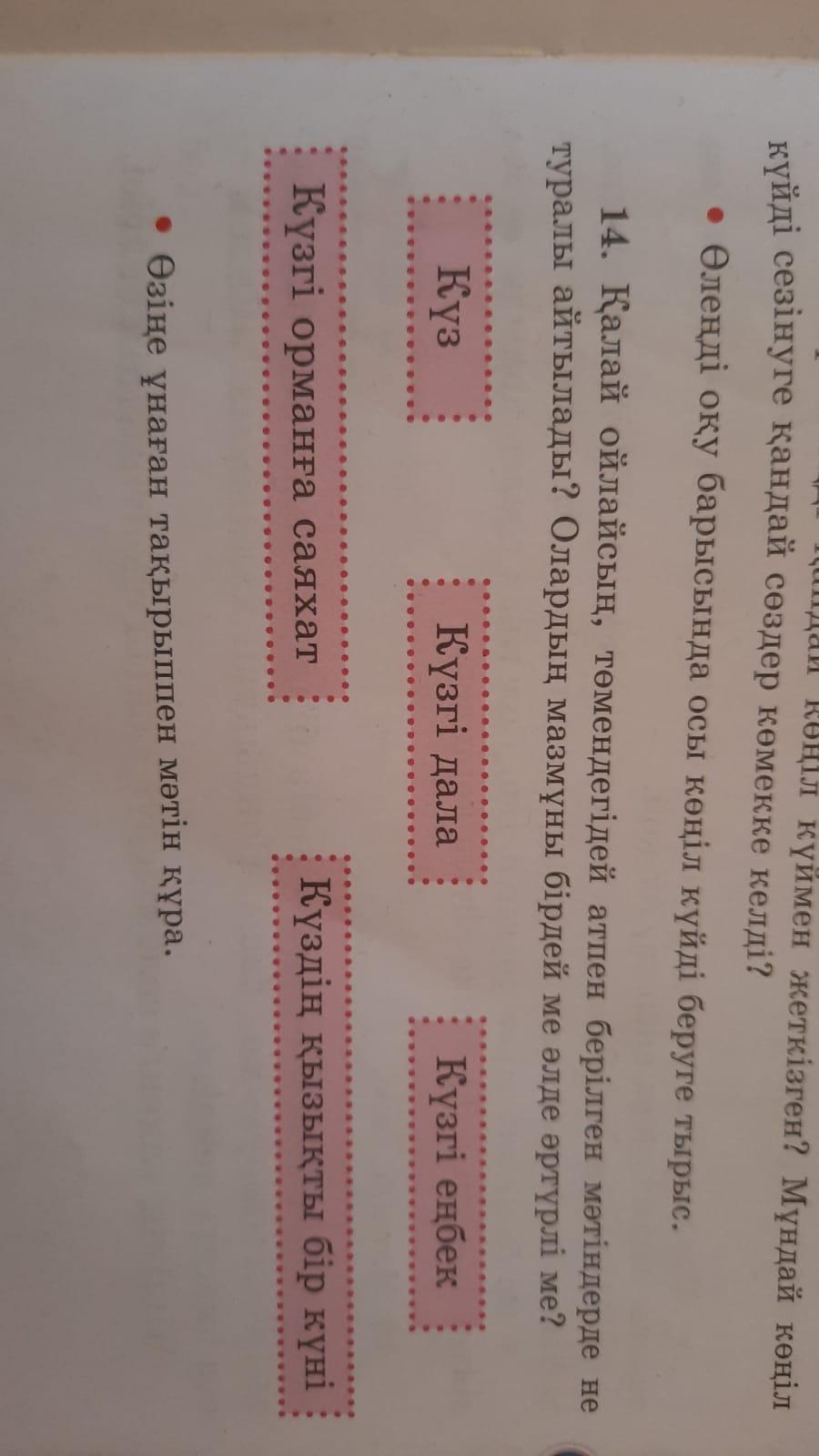 Күз – жылдың төрт мезгілінің бірі.Күзде күн суытып, көлдер мен өзендер тартылып, өсімдіктер қурап, ағаштардың жапырағы түседі. Күн қысқара береді. Егін піседі, мал семіреді. Жыл құстары тізбектеліп, жылы өлкелерге ауып кетеді.