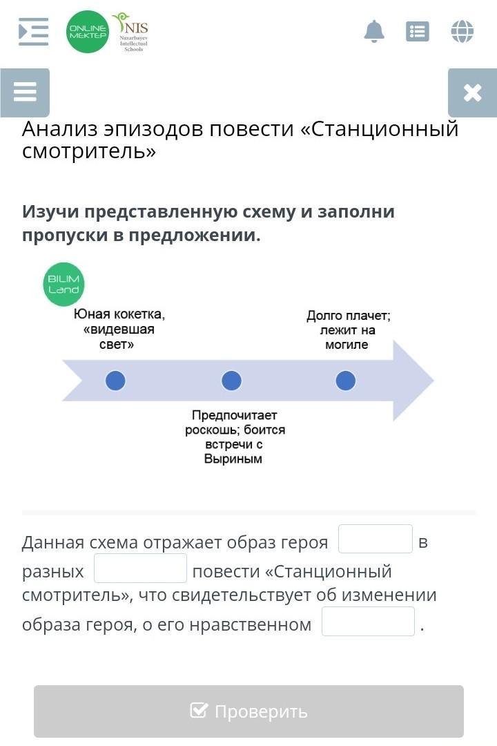 Анализ эпизодов повести «Станционный смотритель» Изучи представленную схему и заполни пропуски в предложении.  Данная схема отражает образ героя в разных повести «Станционный смотритель», что свидетельствует об изменении образа героя, о его нравственном . Назад Проверить