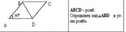 ABCD-ромб Определите вид угла ABD и углы ромба.