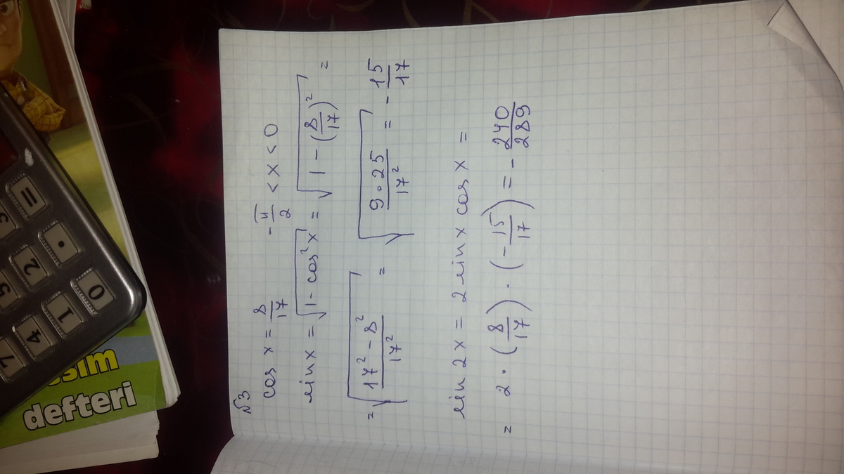 №3 Известно,что cosx = 8/17, -п/2<x<0. Найдите sin2x