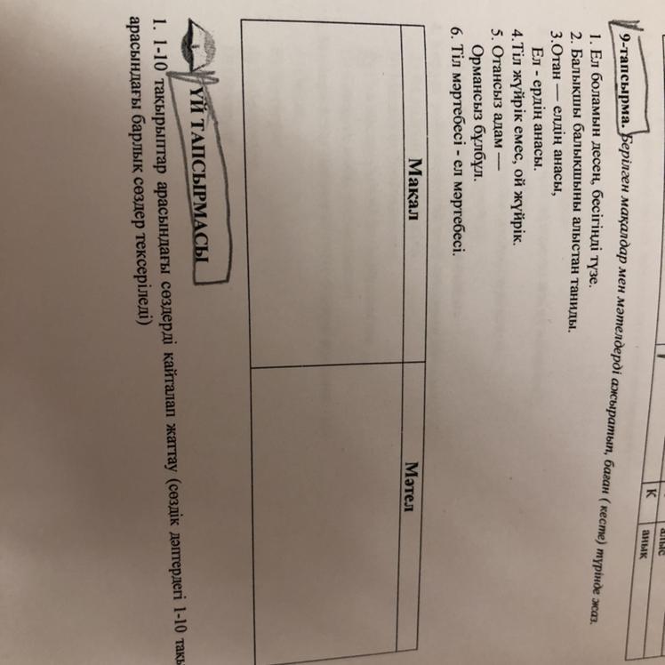 Мақал:Ел боламын десең,бесігіңді түзе;Отан-елдің анасы,Ел-ердің анасы;Отансыз адам,ормансыз бұлбұл;