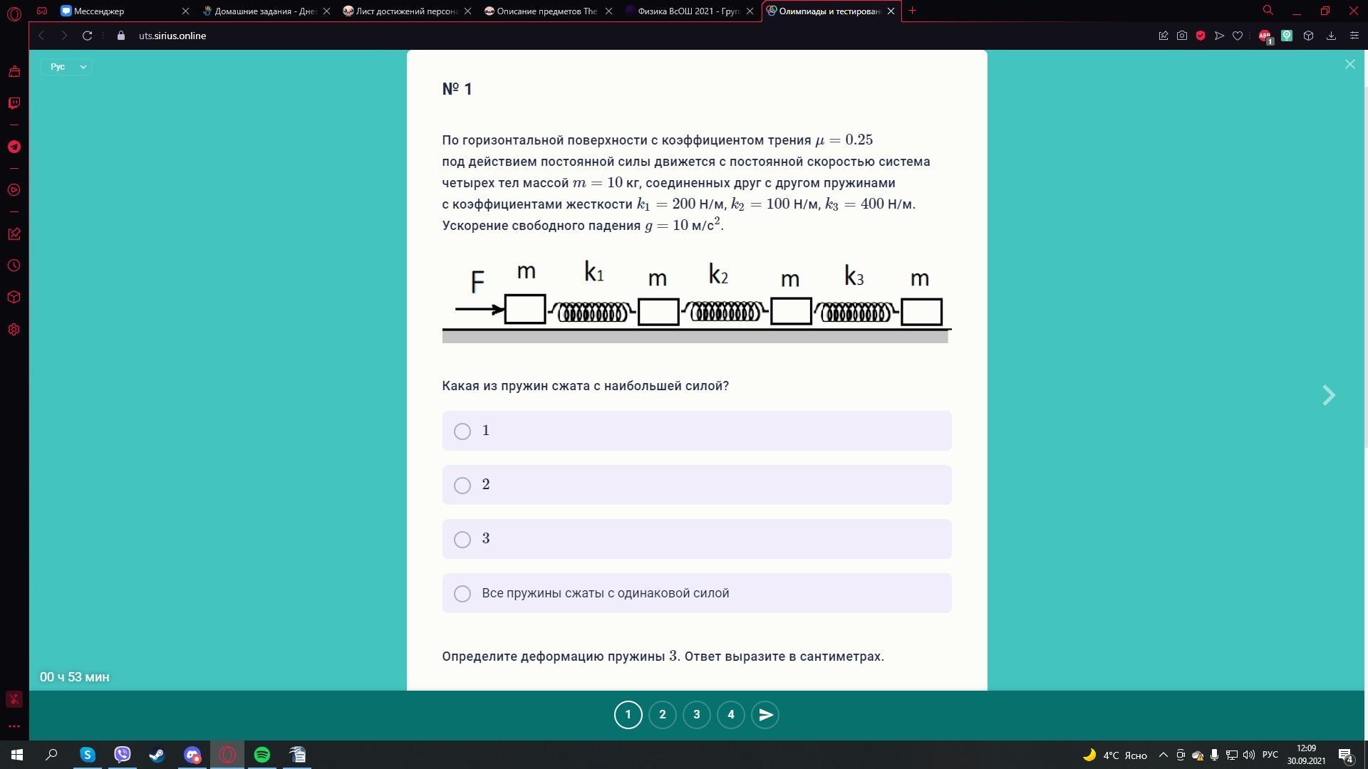 По горизонтальной поверхности c коэффициентом трения μ=0.25 под действием постоянной силы движется с постоянной скоростью система четырех тел массой m=10 кг, соединенных друг с другом пружинами с коэффициентами жесткости k1=200 Н/м, k2=100 Н/м, k3=400 Н/м. Ускорение свободного падения g= 10 м/с2.