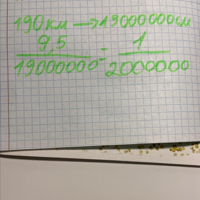 190 км= 19000000 в см 9,5/19000000 скоробить на 9,5 ровно 2000000