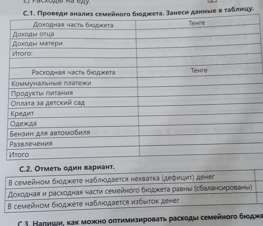 С.1. Проведи анализ семейного бюджета. Занеси данные в таблицу. Доходная часть бюджета Тенге Доходы отца Доходы матери Итого: ecally Тенге Расходная часть бюджета Коммунальные платежи Продукты питания Оплата за детский сад Кредит Одежда Бензин для автомобиля Развлечения Итого С.2. Отметь один вариант.