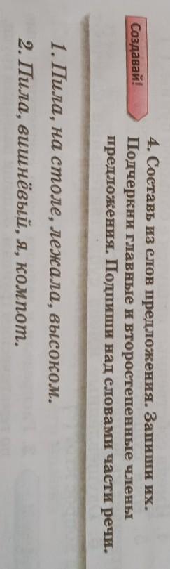 оздавай! 4. Составь из слов предл Подчеркни главные и в предложения. Подпиши 1. Пила, на столе, лежала, ви 2. Пила, вишнёвый, я, компо