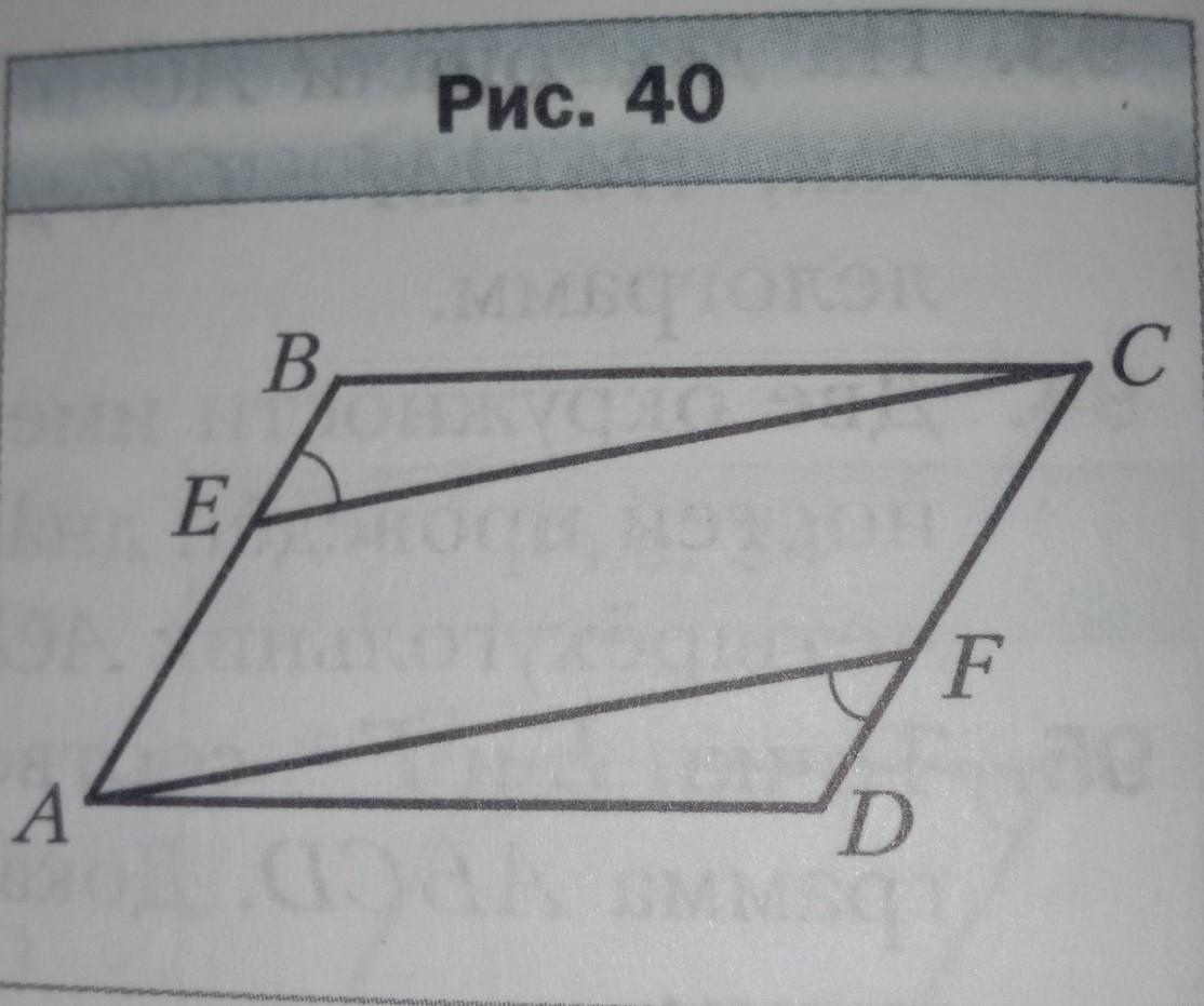 На рисунке 40 четырёхугольник ABCD - параллелограмм, угол BEC = углу DFA. Докажите, что четырёхугольник AECF - параллелограмм.
