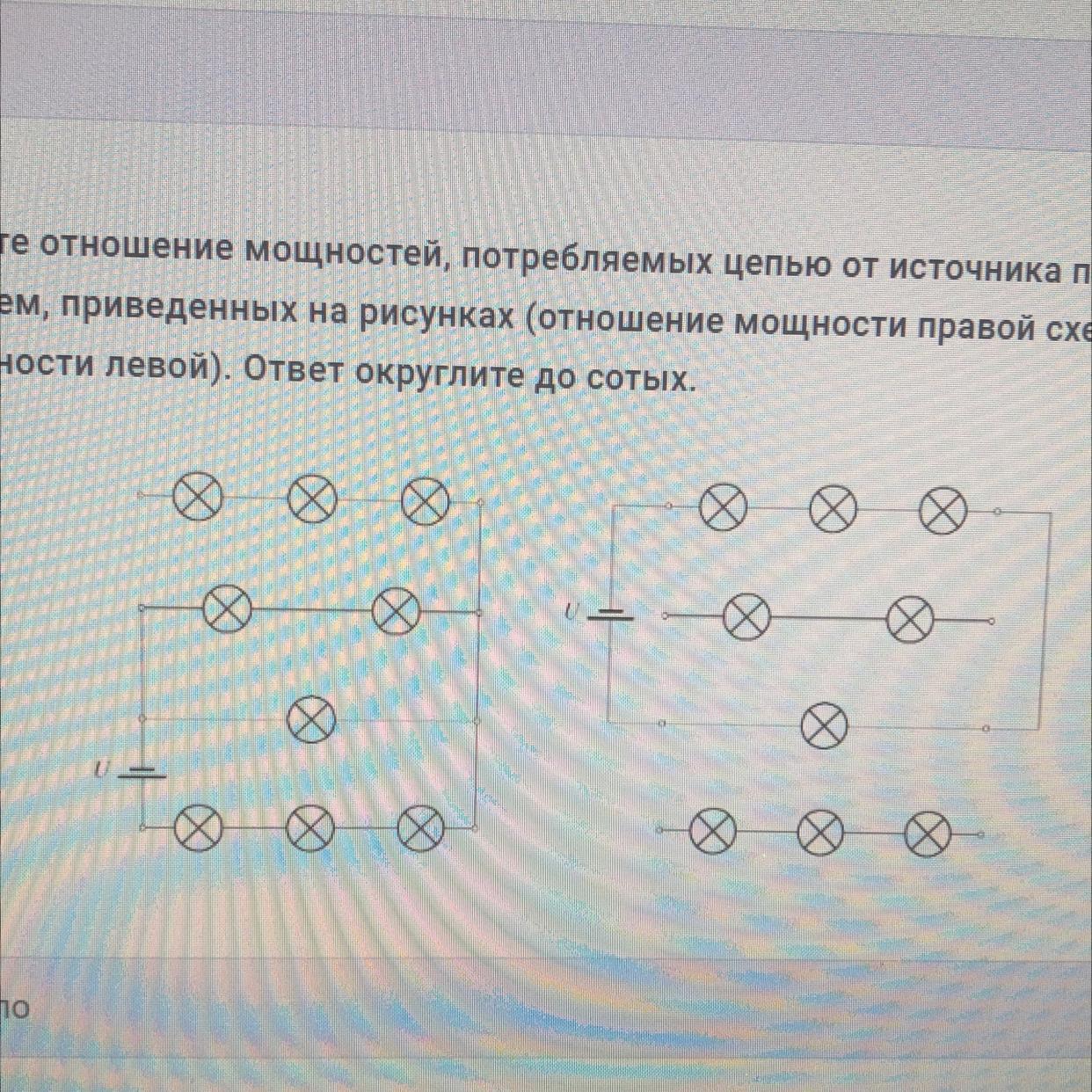 Найдите отношение мощностей, потребляемых цепью от источника питания, для схем, приведённых на рисунках (отношение мощности правой схемы к мощности левой). Ответ округлите до сотых