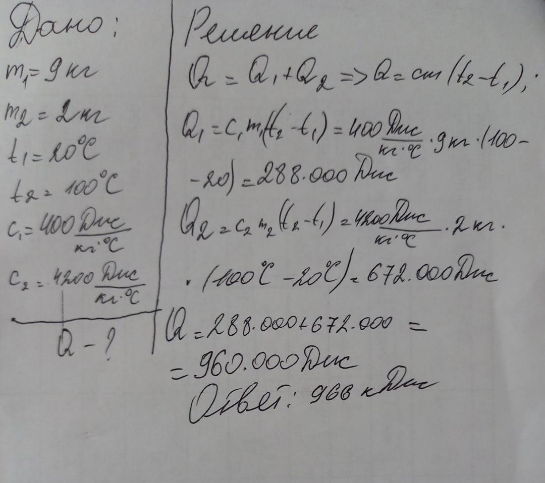 Яка кількість теплоти потрібна, щобу латунній каструлі масою 9 кг Нагріти 2 л води від 20°С до 100С? Питома теплоємність латуні 400Дж/к°С?