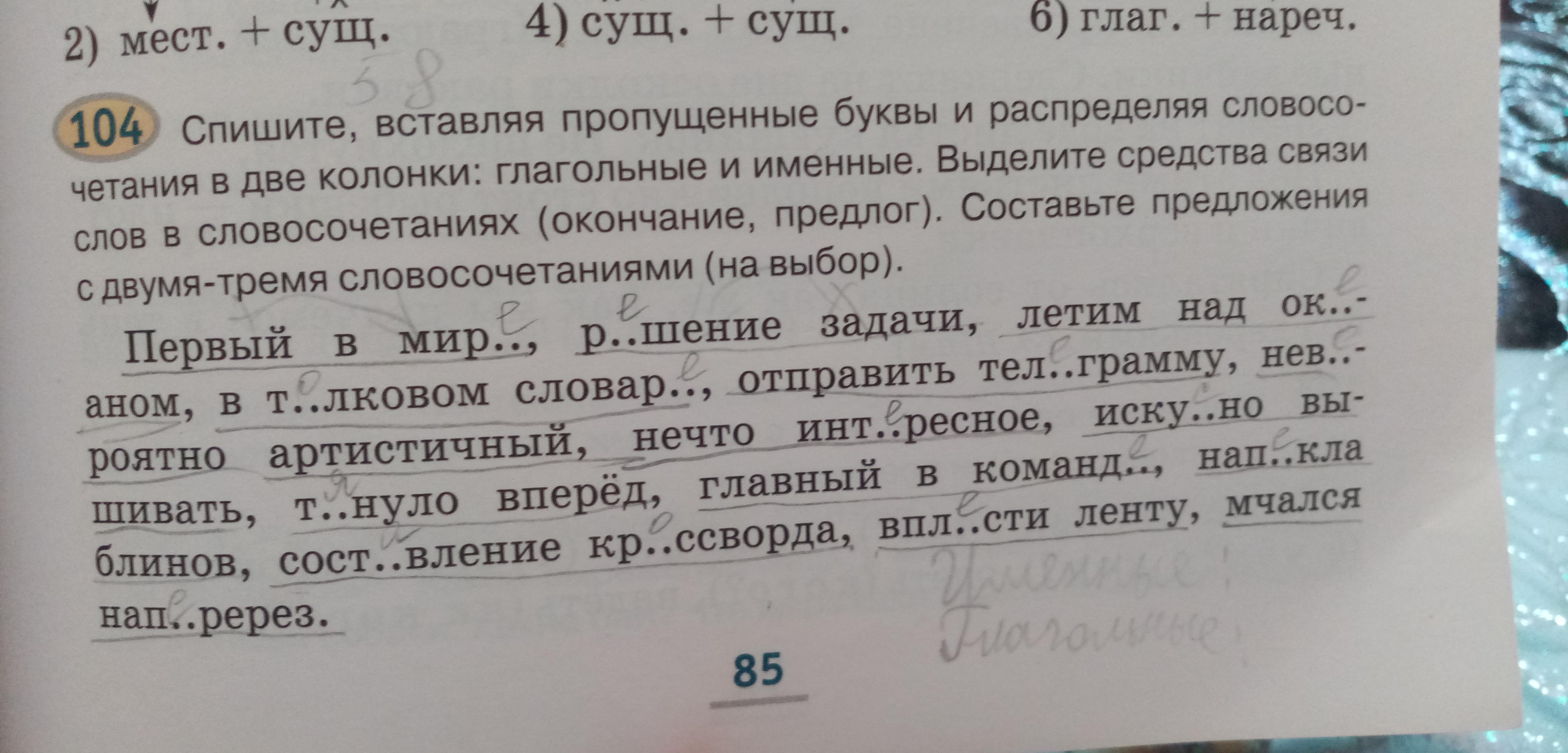 - Глагольные: решение задачи, летим над океаном, отправить телеграмму, искусно вышивать, тянуло вперёд, напекла блинов, вплести ленту, мчался наперерез. Именные: первый в мире, в толковом словаре, невероятно артистичный, нечто интересное, главный в команде, составление кроссворда.
