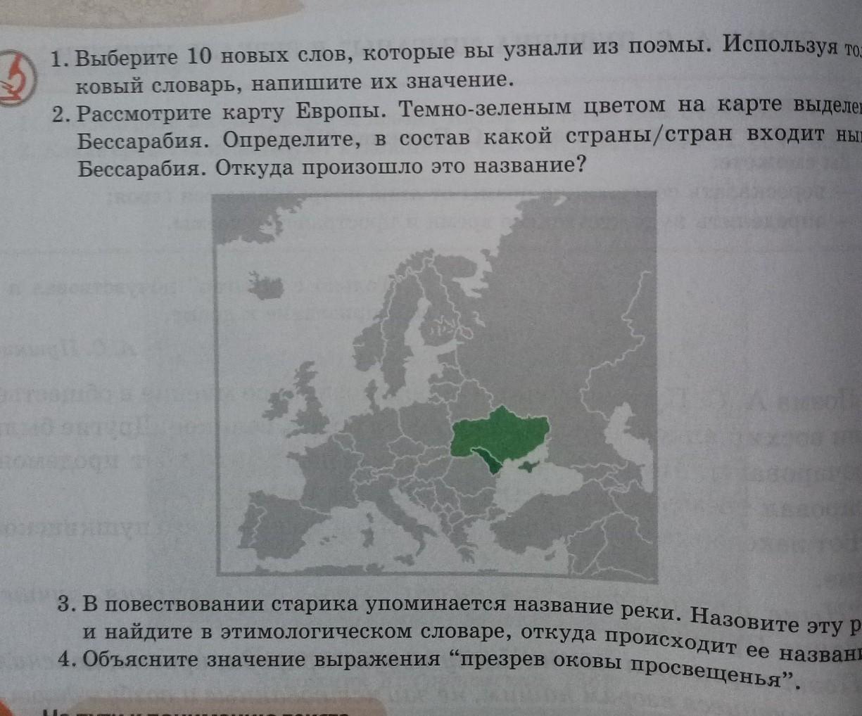 А. 2. Рассмотрите тарту Европы. Темно-зеленым цветом на карте вылее 1. Выберите 10 новых слов, которые Вы узнали из ПОЭМЫ, Используя Бессарабия. Определите, в состав какой страны/стран входит ковый словары, напишите их значение, Бессарабия. Откуда произошло это название?