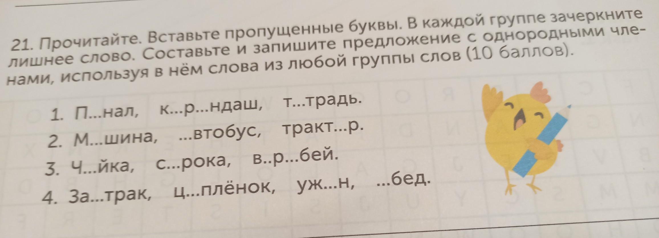 21. Прочитайте. Вставьте пропущенные буквы. В каждой группе зачеркните лишнее слово. Составьте и запишите предложение с однородными чле- нами, используя в нём слова из любой группы слов (10 баллов). 1. П...нал, К...р...Hдаш, Т...традь. 2. М...шина, ...втобус, тракт...р. 3. Ч...йка, С...рока, в..р...бей. 4. За...трак, ц...плёнок, уж...н, ...бед.