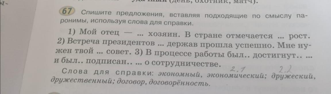 К первому и второму подходит первая пара,к третьему и четвёртому- вторая, к пятому- третья.Хозяин не может быть экономическим, страны дружескими, а договор не может быть достигнут.Поэтому я именно так заполнила пропуски.