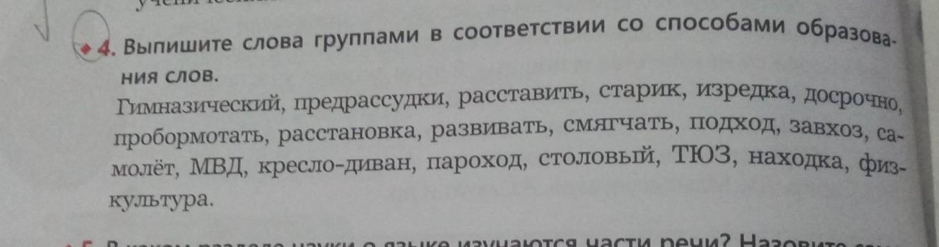 Ответ: Первая группа (суффиксальный способ) - гимназический, старик, столовый, находка. Втораая группа (приставочно-суффиксальеый) - предрассудки, расставить, изредка, досрочно, пробормотать, расстановка, развивать, смягчать, подход. Третья группа (способ сложения - соединение двух или больше слов, или их частей, в одно) - завхоз (заведующий хозяйством), самолет (сам летает), кресло- диван (кресло и диван ), пароход (пар, ходить), физкультура (физическая культура). Четвертая группа (аббревиатура - слова образовываются из начальных букв нескольких слов): МВД (Министерство внутренних дел), ТЮЗ (Театр юного зрителя).