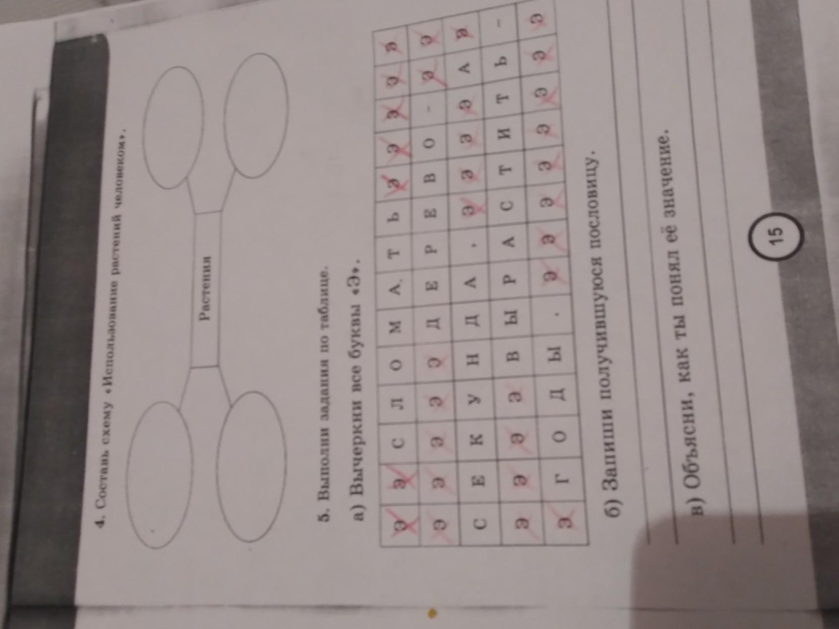 4. Составь схему «Использование рахеиий человек, Растения 5. Выполни задания по тајулице. а) Вычеркни все буквы «э». с 3 Л А. "Т р E B Э Э Э А. O DI A Н 5 С E к И т Э B P BI b a э э з Ы г о д б) Запиши получившуюся пословицу. в) Объясни, как ты понял её значение. 15
