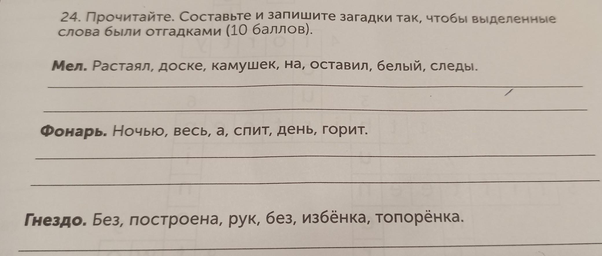 24. Прочитайте. Составьте и запишите загадки так, чтобы выделенные слова были отгадками (10 баллов). Мел. Растаял, доске, камушек, на, оставил, белый, следы. Фонарь. Ночью, весь, а, спит, день, горит. Гнездо. Без, построена, рук, без, избёнка, топорёнка.