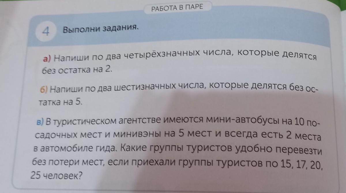 4 Выполни задания. а) Напиши по два четырёхзначных числа, которые делятся без остатка на 2. 6) Напиши по два шестизначных числа, которые делятся без ос- татка на 5. в) В туристическом агентстве имеются мини-автобусы на 10 по- садочных мест и минивэны на 5 мест и всегда есть 2 места в автомобиле гида. Какие группы туристов удобно перевезти без потери мест, если приехали группы туристов по 15, 17, 20, 25 человек?