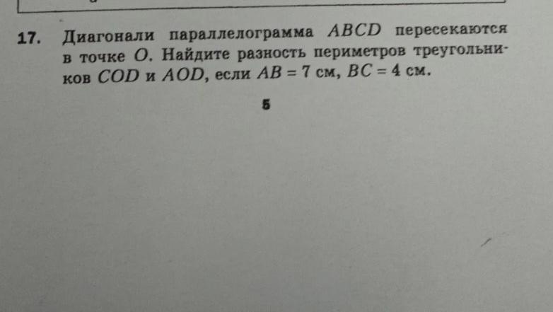 Диагонали параллелограмма ABCD пересекаются в точке О. Найдите разность периметров треугольников COD и AOD если АВ = 7 см, ВС= 4 см. 8класс!!!!!!