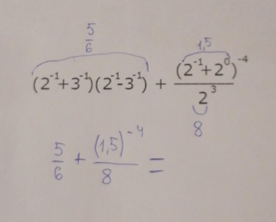 ( 2⁻¹ + 3⁻¹)( 2⁻¹- 3⁻¹) + ( 2⁻¹ +2⁰)⁻⁴/2³ = ( 2⁻¹)² - (3⁻¹)² + ( 1/2 + 1 )⁻⁴/8 =