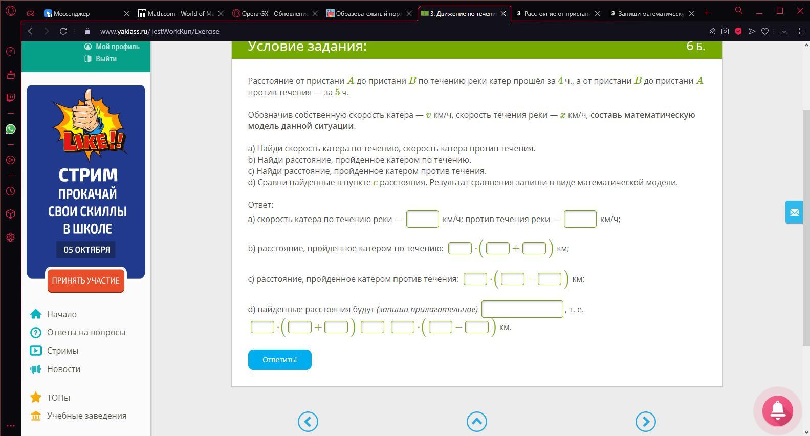 Обозначив собственную скорость катера — v км/ч, скорость течения реки — x км/ч, составь математическую модель данной ситуации.