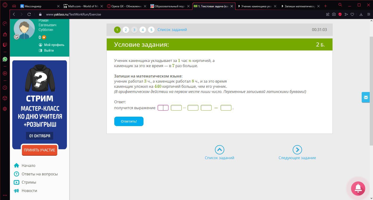 каменщик уложил на 440 кирпичей больше, чем его ученик.