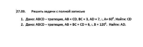ABCD трапеция,AB = CD, BC = 3 см AD = 7 сантиметров, угол А = 60°. Найти CD