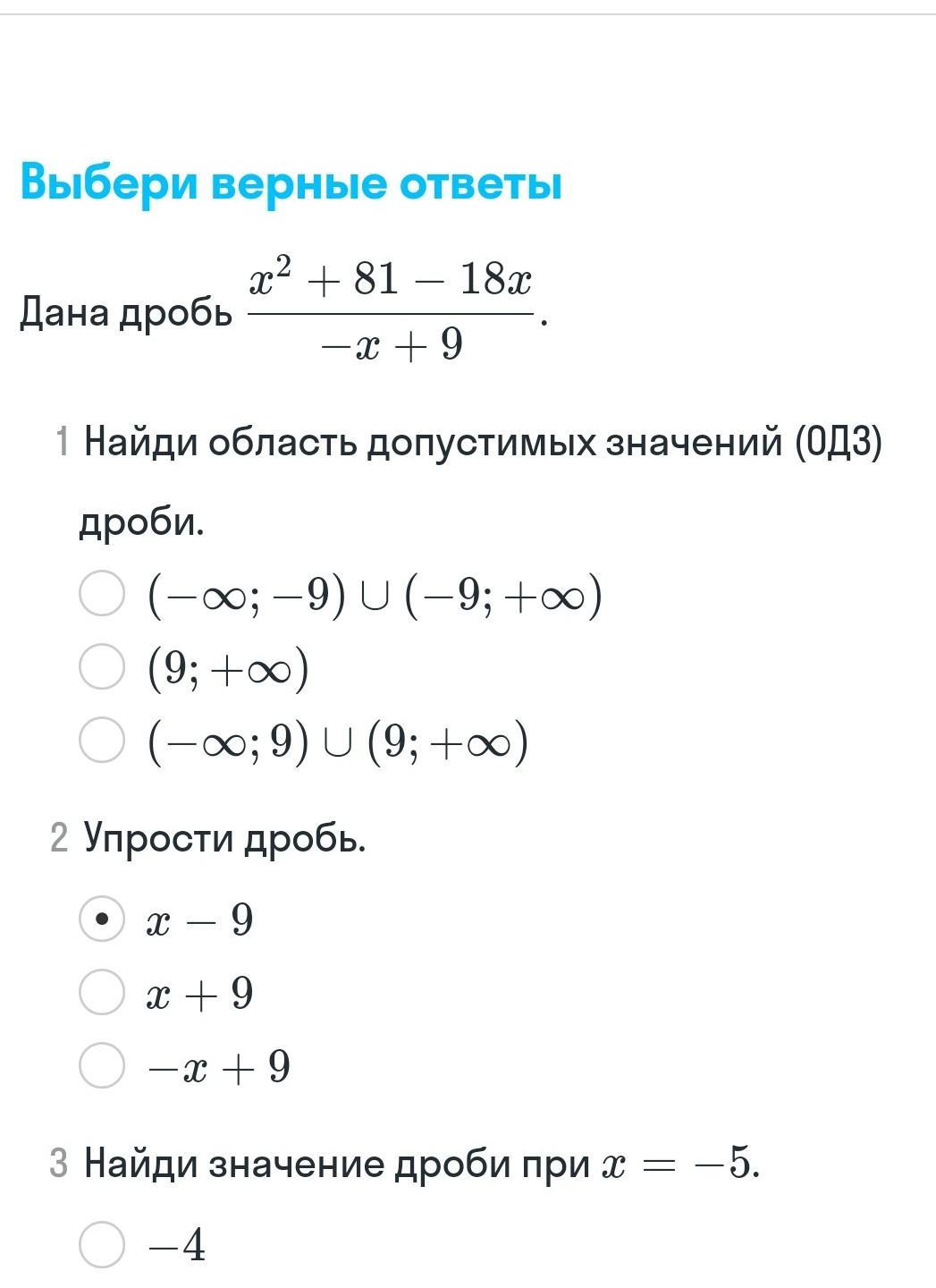 1. ОДЗ - это все те значения, которые может принимать х. В данном примере х не может быть равен 9 т.к. в таком случае в знаменателе будет 0 (а это недопустимо). Других ограничений нет.