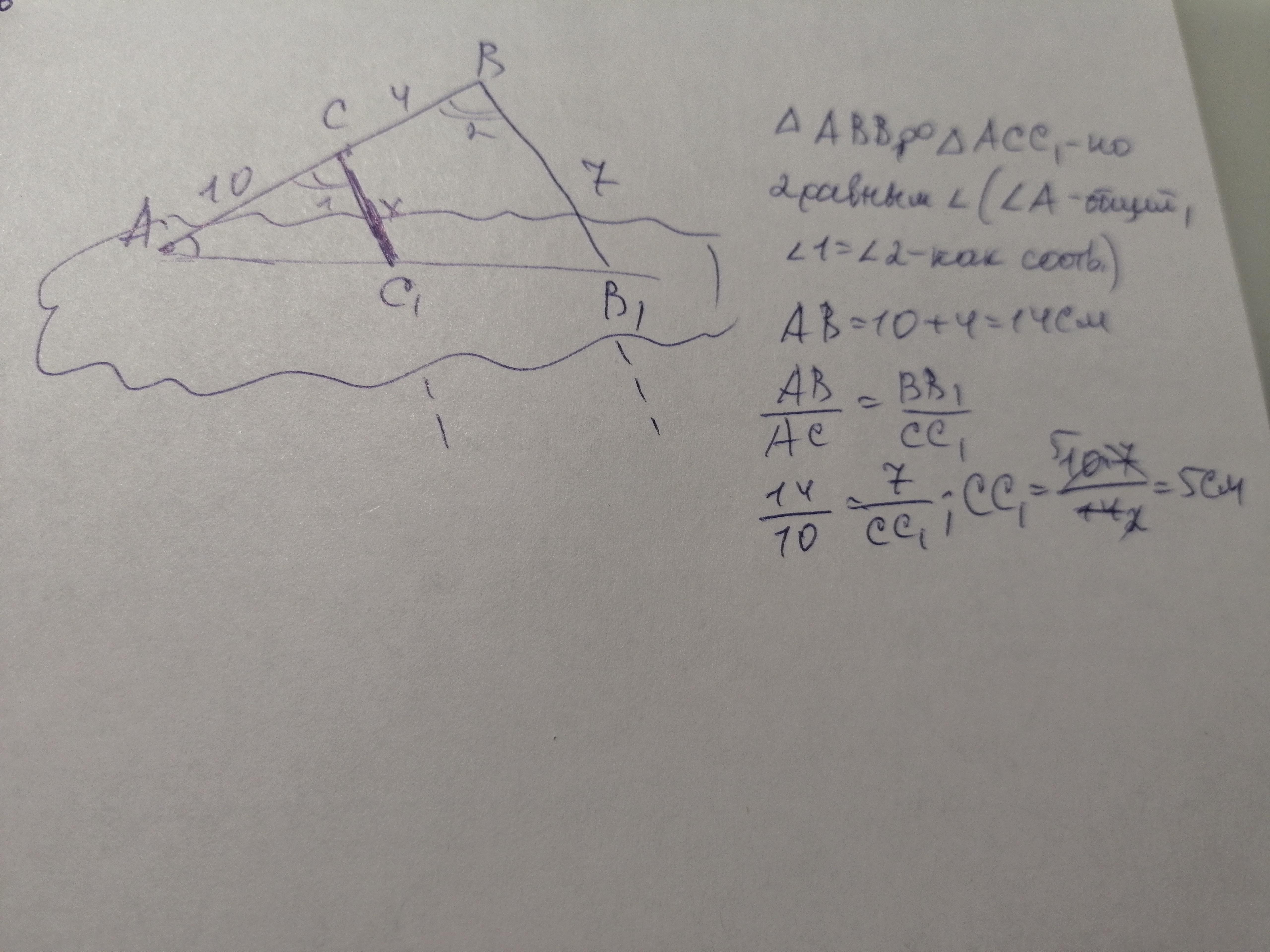 12. Через конец А отрезка АВ проведена плоскость. Через конец В и точку С, которая принадлежит отрезку АВ, проведены параллельные прямые, пересекающие плоскость в точках В1 и С1. Найдите длину отрезка СС1, если АС=10см, ВС=4см, ВВ1=7см.