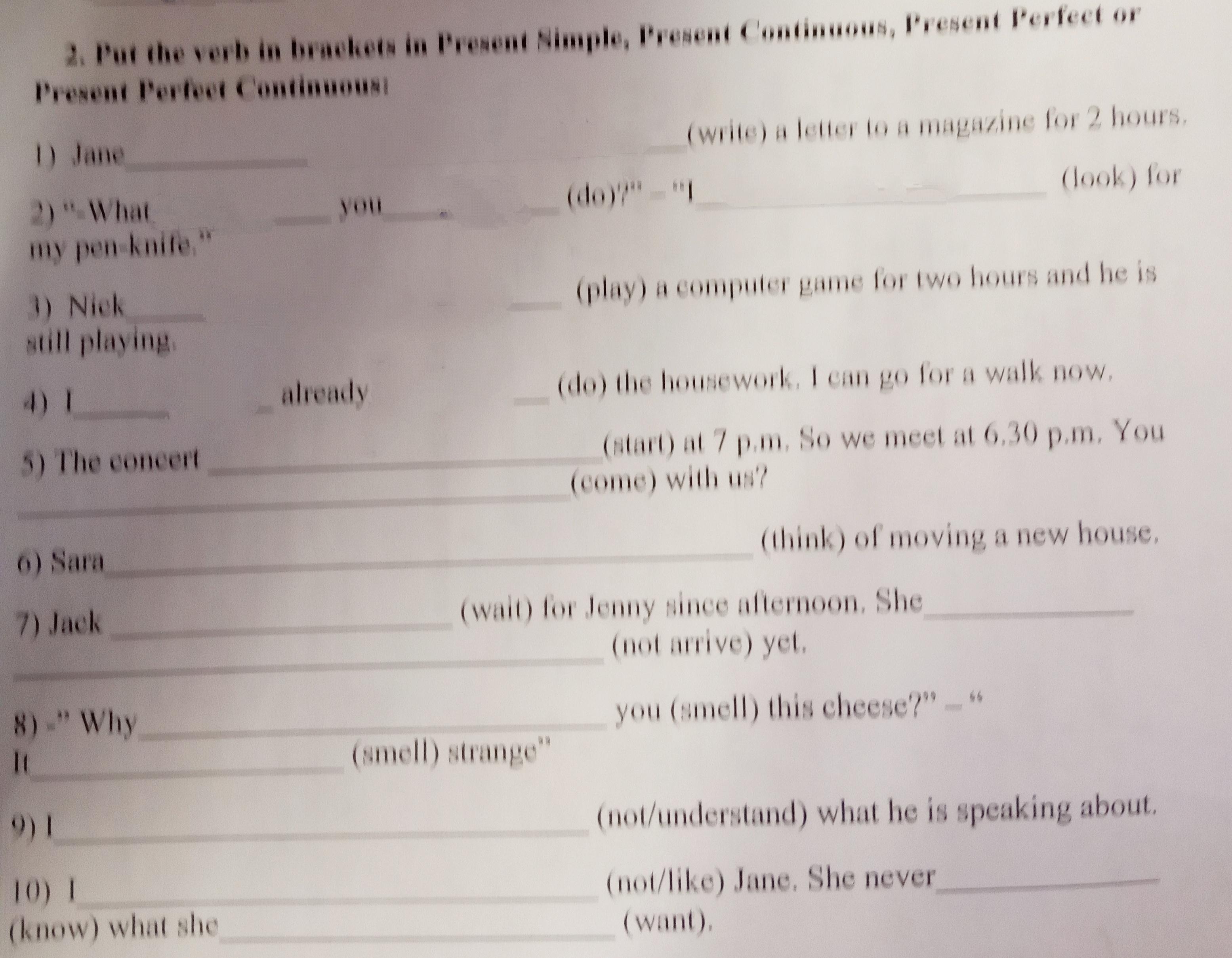 Преобразуйте слова в скобках в нужную форму. Present Simple, Present Continuous, Present Perfect и Present Perfect Continuous.