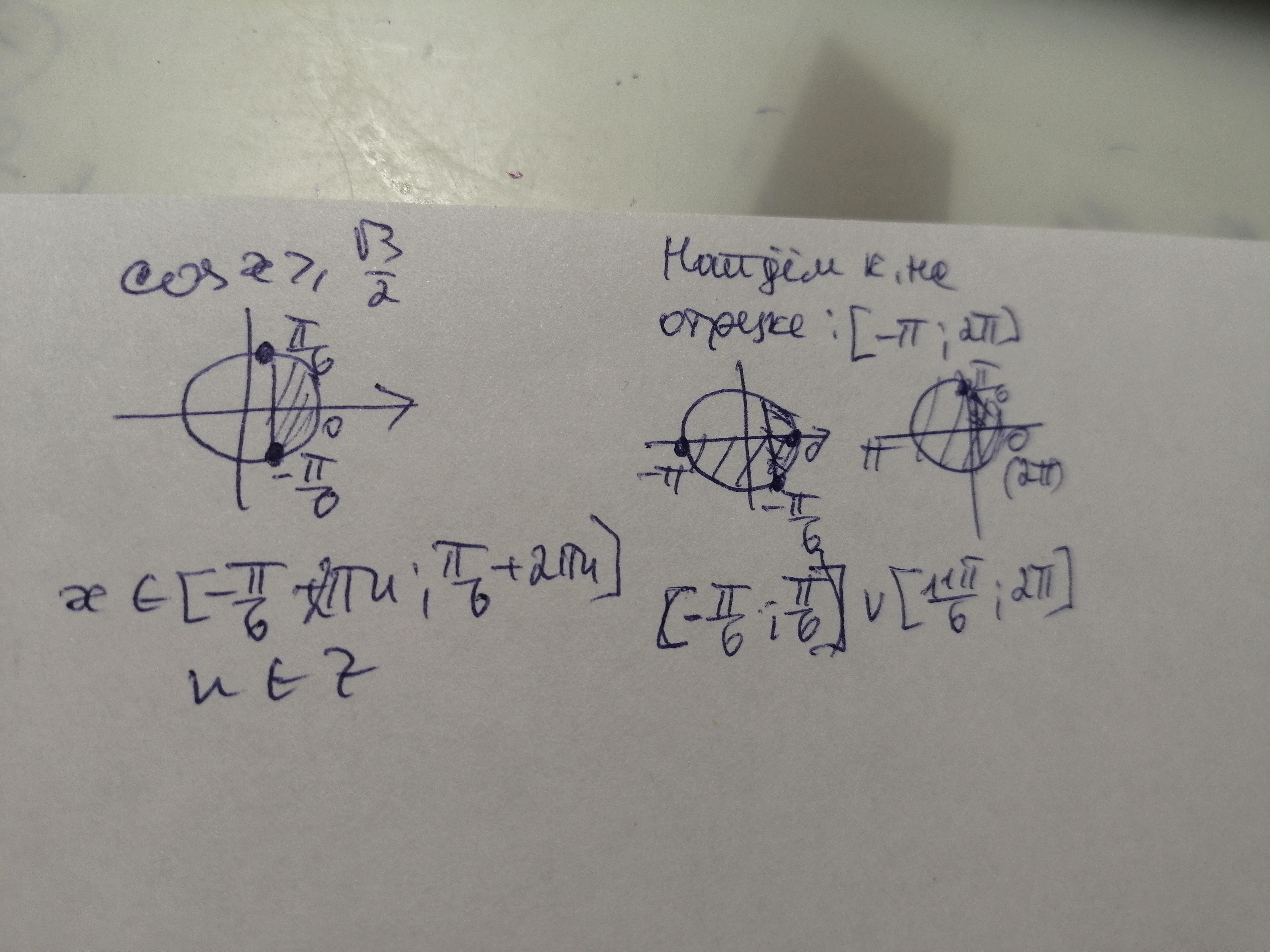 Найти все принадлежащие отрезку⦋-π;2π⦌ решения неравенства соsx≥корень из 3/2.